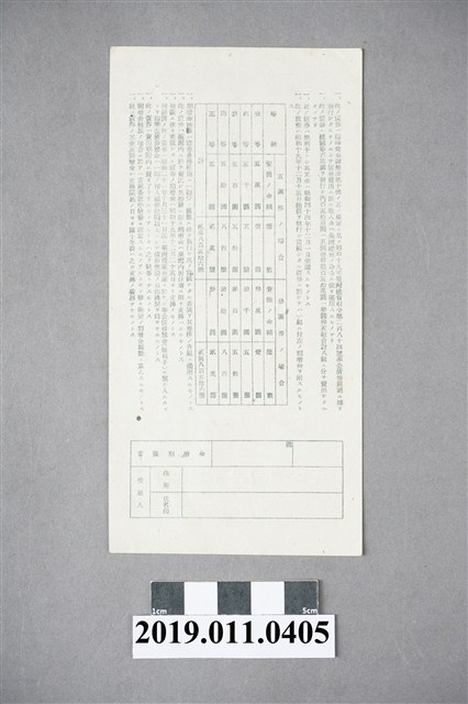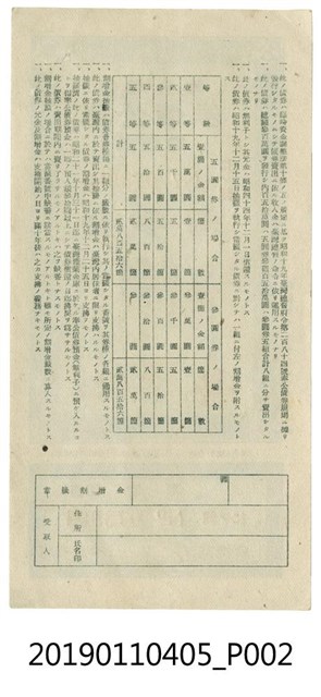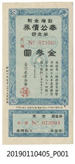 本文物為昭和19年(1944)10月割增金附奉公債券第壹回金參圓,為臺灣產業金庫依照臨時資金調整法所發行。在1944年12月25日抽籤,票券下附收據為抽籤憑證,債券背面則附有債券法條及抽籤說明。