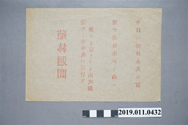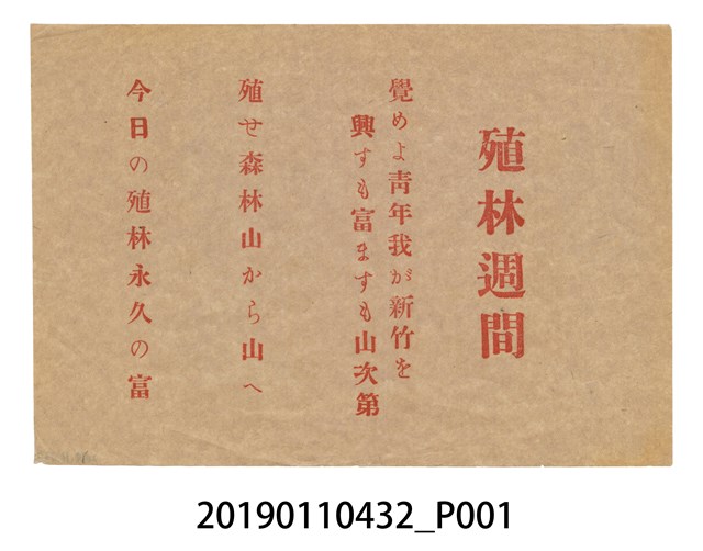 本文物為新竹州植林運動週宣傳單,旨在推廣新竹青年的參加植林運動,一起為森林的繁茂而努力,強調今天的植林創造永久的財富。