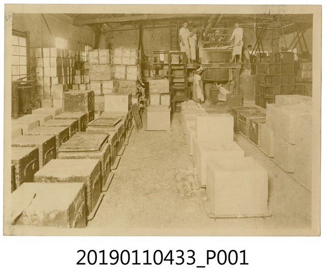 本文物為日治時期石鹼製造工廠照片,所謂的石鹼便是肥皂,在照片中工人們正透過木製石鹼製造機器生產肥皂中,成品則是裝箱置於工廠內。