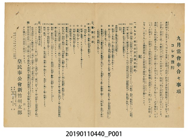 本文物為昭和18年(1943)皇民奉公會新竹州支部有關霍亂病例之預防傳單,內容提及霍亂病狀、預防方法、野菜消毒法等。