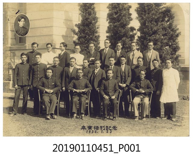 本文物為1936年1月23日臺北帝國大學醫學部(現今臺灣大學醫學院)畢業生合影照片。1928年時臺北帝國大學成立之初並未設醫學部,1936年臺北醫學專門學校併入臺北帝國大學後,才正式創設醫學部。