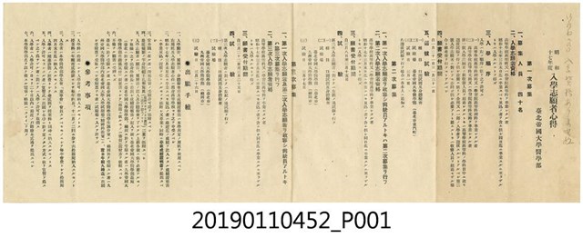 本文物為昭和17年(1942)臺北帝國大學醫學部(現今臺灣大學醫學院)招生簡章,此次招生人數為40名。分為三階段招生,當第一階段未滿則有第二階段招生,但三階段依此類推之,另外還有入學手續及參考事項。1928年時臺北帝國大學成立之初並未設醫學部,1936年臺北醫學專門學校併入臺北帝國大學後,才正式創設醫學部。