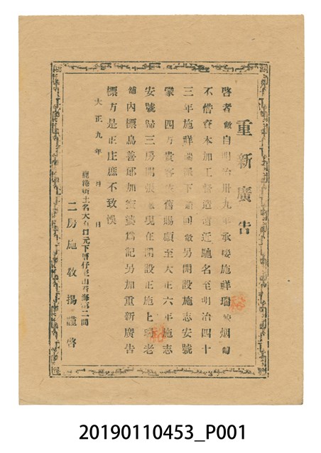 本文物為大正9年(1920)鴉片煙館之廣告單,廣告內容提及此煙館自從開張以來,歷經幾任易主都不敢怠慢且遠近馳名,大正7年(1918)後由三房所館到現在,現在再次廣告特此聲明讓眾人所知曉。