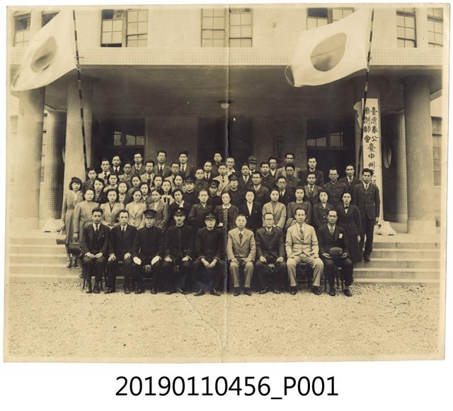 本文物為昭和16年(1941)臺灣奉公藥劑師會臺中州支部會員合影照片,在照片中藥劑師成員有男有女,拍攝成員的兩旁則有兩面大日本旗。