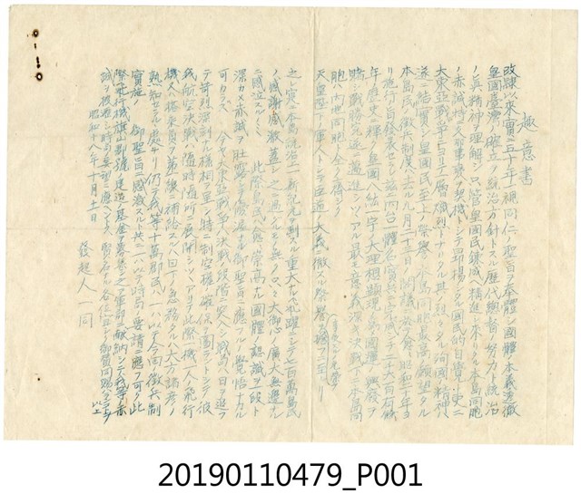 本文物年代為日治時期,為一手寫的意向書,其左上角有些微破損。意向書中寫道「改隸以來實ニ五十年一視同仁,聖旨ヲ奉體シ國體,本義透徹皇國臺灣……殉國精神ハ遂結實シ皇國民至上……飛行機旗山郡號建造基金ヲ募集」。其內容在讚頌大日本帝國對臺恩惠,歷經支那事變及大東亞戰爭,國民自覺提升,殉國精神昂揚,並透過意向書來募集建造飛機的基金。