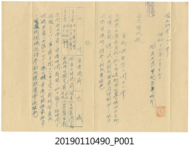 本文物為日治時期由觀音庄長宇都宮龜治郎寫給各區代表的公文。文件可分左右兩側,右側為發文者及公文內容,左側為時間、地點、場所。公文中有提及「供出金物」、「受渡所」等字。而該活動的舉辦分兩梯次,第一梯次於上午舉辦,地點在觀音庄役場,參與範圍為觀音派出所管區內;第二梯次為下午舉辦,地點為許阿穎家。