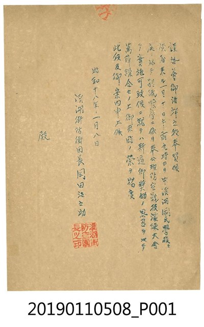 本文物年代為昭和時期,出自溪湖街防衛團長岡田治之助,文物上蓋有「溪湖街防衛團長之印」。文物中寫有「謹啟薈御清祥之段奉賀候」、「一月十日午前九時ヨリ中溪湖國民學校庭於テ別紙順序ニ依リ奉公班防公班戰技演練大會實施……」等字,文末為時間「昭和十八年一月八日」。