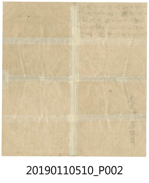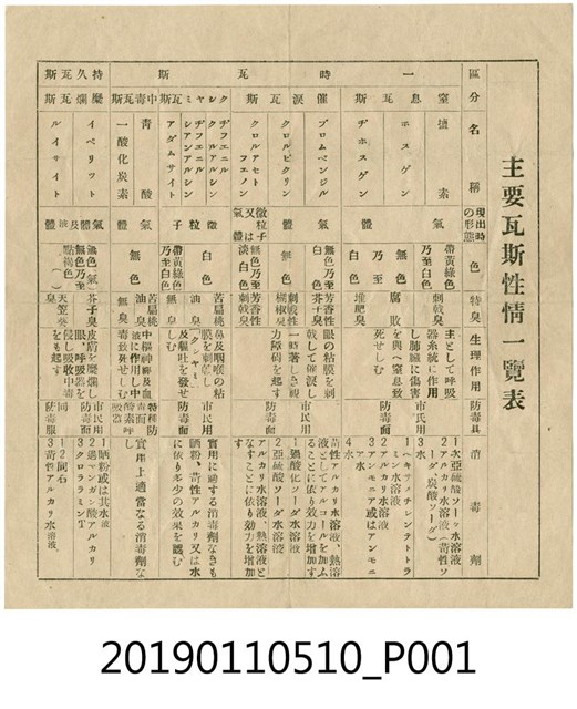 本文物年代為日治時期,為介紹各化學氣體的特性。表格將氣體分為窒息、催淚、刺激性及腐蝕性等四大項,並列舉13項氣體,如「塩素、ホスゲン、ヂホスゲン、青酸、一酸化炭素……」等,其中腐蝕性氣體以芥子毒氣及路易氏劑為代表表格內列舉之氣體對呼吸系統、眼睛黏膜、鼻咽、中樞神經、皮膚等都有不同程度的侵害。表格最下方為應對的防毒面具及消毒劑。文物背面寫有「南投防毒班員」、「敵機カう瓦斯攻擊……」等字