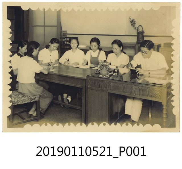 本文物年代不詳,為一黑白相片,其保存狀況良好。相片四周可見白色波浪紋。相片中有6名女性及1名男性,皆拿筆在記事。相片右側桌上有一罐鋼筆用的墨水及小盆栽,人群後方的櫃子上擺有竹編的花籃。