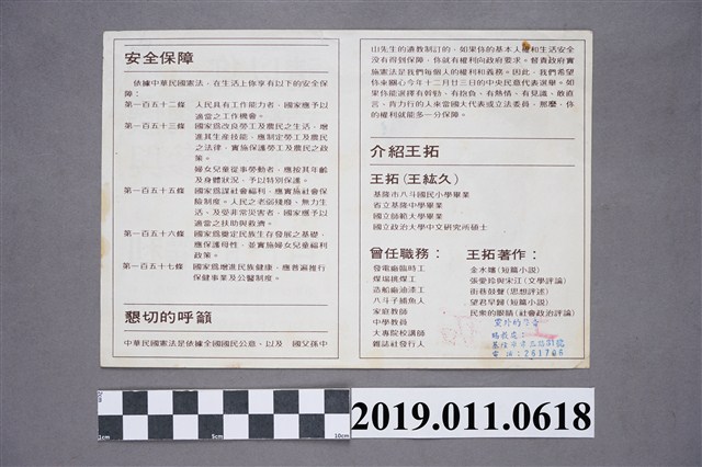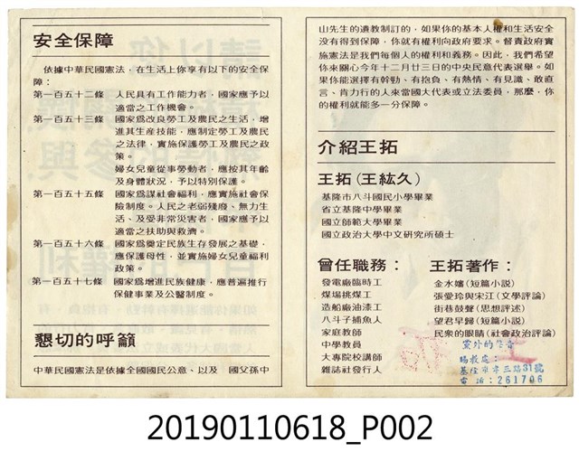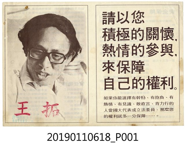 此物件為王拓參與1978年中央民意代表的選舉宣傳單,內容包含王拓的基本資料、擔任職務以及著作,另印有相關的競選理念與口號。 王拓,本名為王紘久,為臺灣的小說家、政治家,在1944年於基隆八斗子出生,王拓畢業於臺灣師範大學、政治大學中國文學研究所,畢業後在政大擔任講師,並且擔任《文學季刊》的編輯,以及在林海音創辦的《純文學》雜誌上發表作品。在1977年,投入「臺灣鄉土文學論戰」之中,其文學理論使他成為論戰中鄉土派的主將。 之後在1978年投入與本物件相關的基隆市國民大會代表選舉,但因為「退出聯合國」、「臺美斷交」等一系列外交危機,導致此次選舉遭到取消。後加入《美麗島》雜誌社並於「美麗島事件」中遭到逮捕,判刑6年。出獄後創辦《文藝雜誌》並擔任夏潮聯誼會第一任會長,另曾參與創辦工黨,最終加入民主進步黨,後擔任第3至6屆立法委員,以及第10任行政院文化建設委員會主任委員。