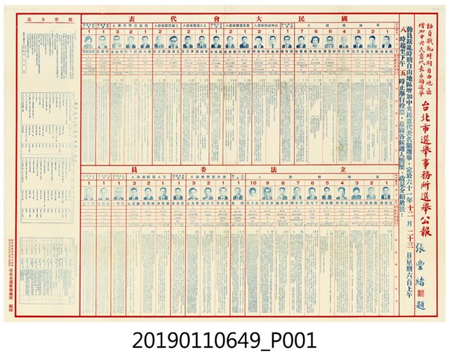 臺北市選舉事務所印發《動員戡亂時期自由地區增加中央民意代表名額選舉選舉公報》