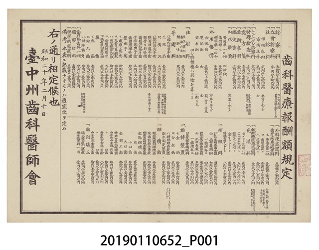 齒科醫療報酬額規定(臺中齒科醫師會-右ノ通○相定侯也)