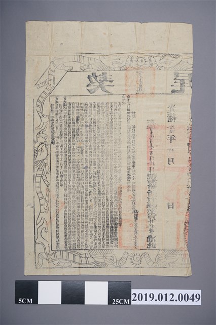 本則文物屬於政府公告,公告中明訂向業戶收稅的流程與相關契字。收稅流程為:布政司使奏請州縣經收稅銀將契尾粘連存貯,十號申送府州查發并知府直隸州照洲縣例徑送藩司處,但為防貪吏以大報小、奸民爭執之事,由布政司統一契尾格式及編列號,前半幅照常書寫業戶買賣田房數目等,後半幅預備用印,已投稅時將契價、稅銀數目大字填寫鈴印處,讓業戶看明後當面截開,前半給業戶留存收執,後半幅同季冊彙送布政司查核。本契尾為業戶林欽華購買許家楓位於紅毛港的水田埔園,包含土地的價格。