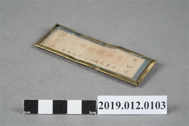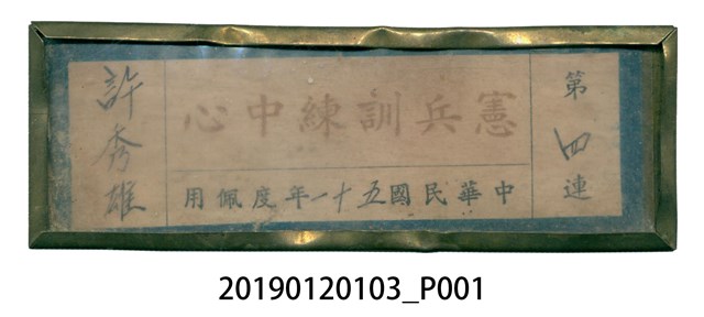 為憲兵訓練中心第四連許秀雄之名牌,中華民國五十一年(1962年)度配用。
