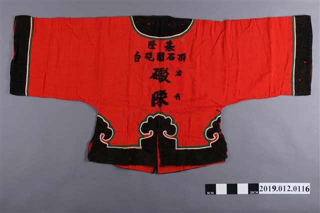 本文物為基隆頂石閣砲臺礮隊右哨上衣(號衣),以紅色為基底。衣服袖口以及下擺有黑色雲紋,並以白色及綠色繡線鑲邊。號衣多是舊時兵卒所著之制服,帶有編號。基隆頂石閣砲臺,為清法戰爭時於基隆中正區所設之砲臺,而礮隊所指為砲隊。本文物單就其型制難以判斷年代。