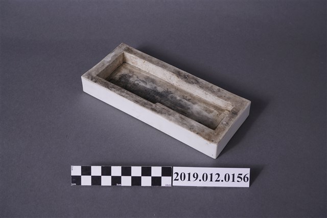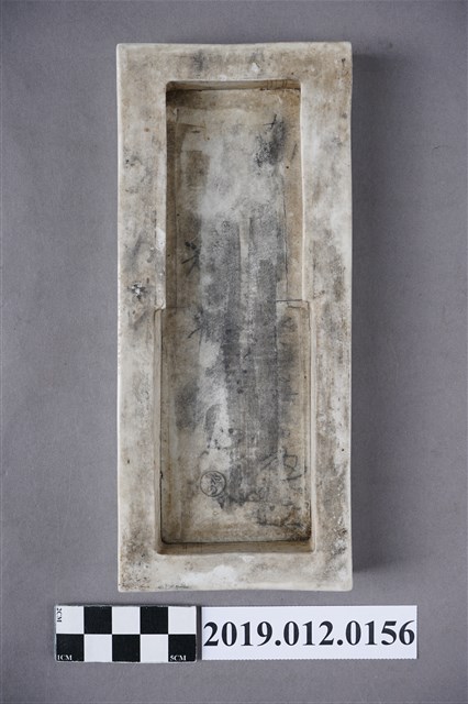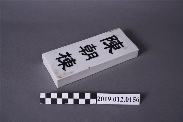 此為日治時期陳朝棟之名牌,共兩塊,無法確知年分,以白磁製成,背面挖空,形狀為長方形,其中一塊已稍微掉色。