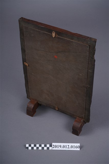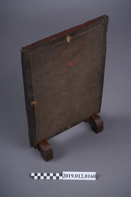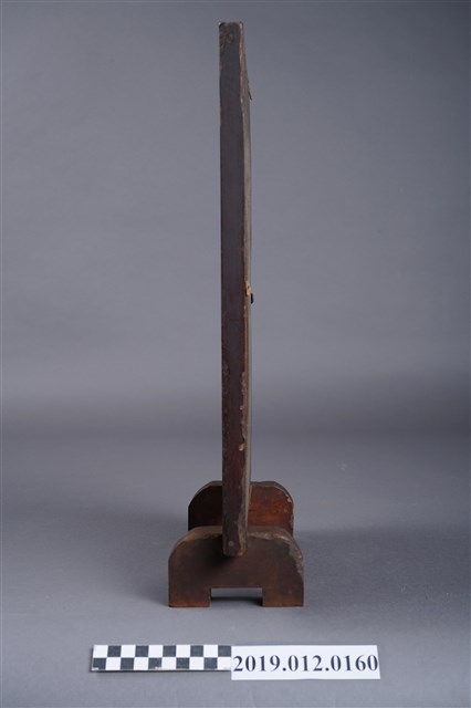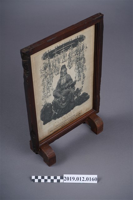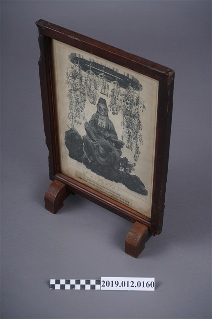 本文物為北港郡佛教聯合會於昭和17年(1942)7月10日印刷,7月12日發行的神像照片,其中央為一神像照片,在神像周圍則繞有許多金屬法器。在照片下方寫有相關的出版資訊,如發行人及印刷人等資訊,而整張照片,放入一木頭製小屏風中。