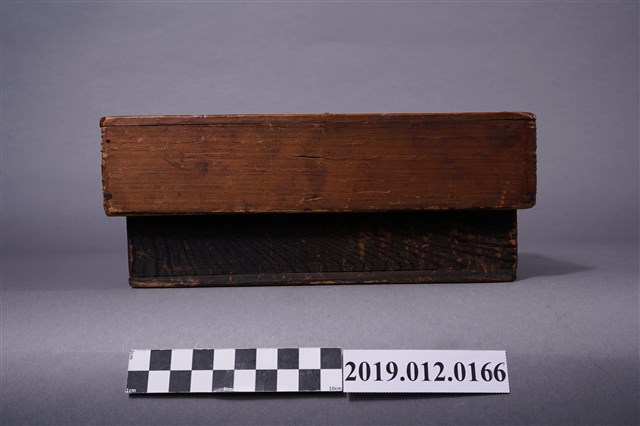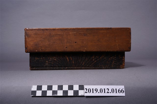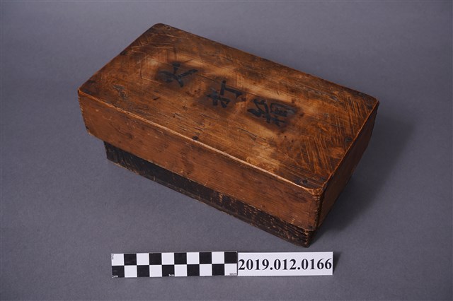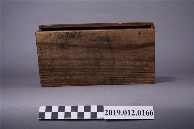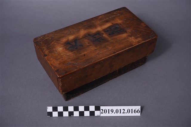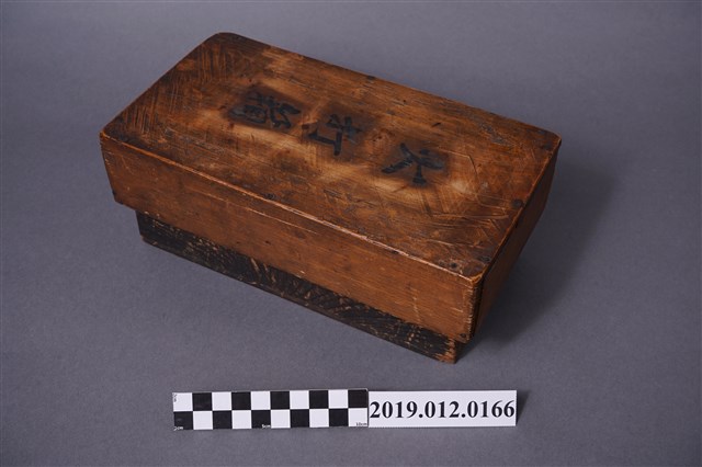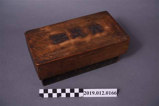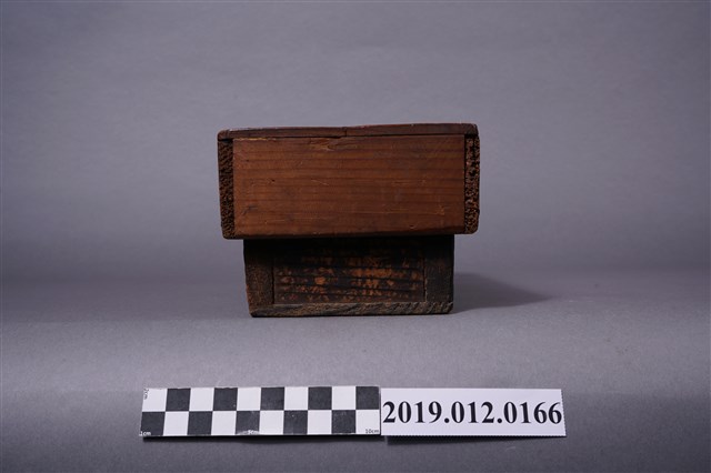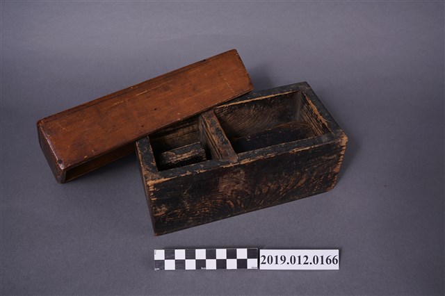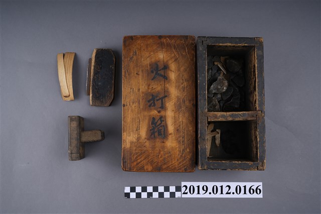 此為一日治時代之火打箱,外觀為一木盒,內裝有許多應是打火石的小石子,以及兩塊不知作用的T型木塊,木盒已有些破舊與磨損磨黑。