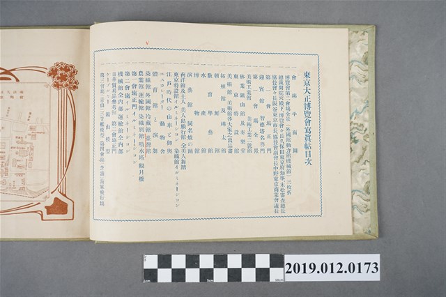 本文物為大正3年(1914)東京大正博覽會寫真帖,其封面以日文漢字及英文書寫,內容除以日文書寫博覽會的介紹,全為黑白照片,在末頁附有印刷、出版日期及印刷所、發行所等出版資訊。為慶祝大正天皇登基,大正3年(1914)3月20日至7月31日,於東京上野舉辦大正博覽會,會場面積達168,000坪,入場人數達7463.000人,而其會場當中,更是引進當時國內外最新穎的科技,如日本最早的電扶梯。在此博覽會中,也設有滿州館、朝鮮館、臺灣館,展示當地物產文化等,而其中臺灣喫茶店更是引發熱潮。