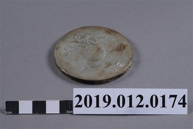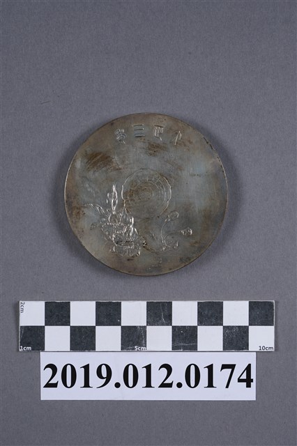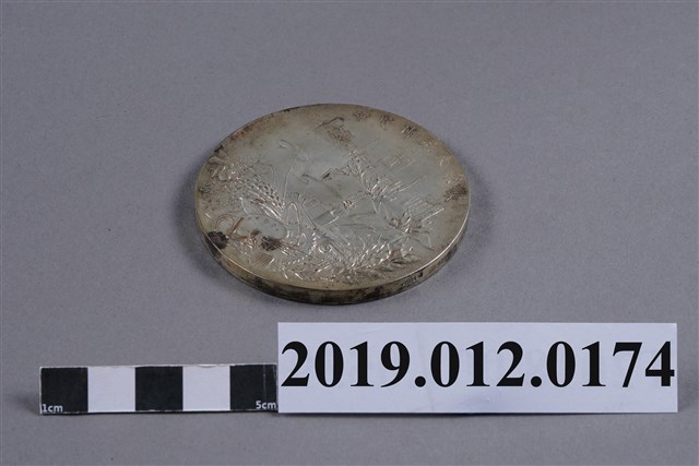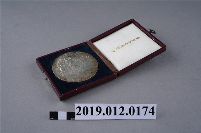 1. 本文物為東京大正博覽會紀念銀牌,附有一深咖啡色帶有金邊的盒子,上面有一金色圖案及以金色為底的「銀牌」二字,而盒中也寫有「東京大正博覽會」的金色字樣。銀牌上刻有繁複的圖案,並刻有「東京大正博覽會」;其背面則刻著「大正三年」,下方則有一圓形狀的圖案及花朵的雕刻。