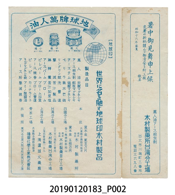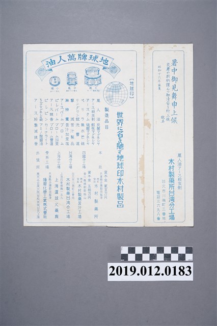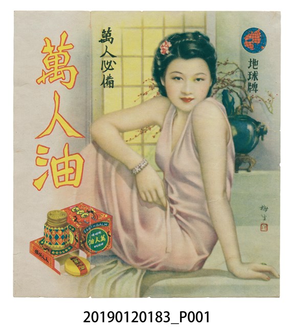 本文物為昭和16年(1941)地球牌萬人油所發行的美女廣告,為彩色印刷,在廣告右下方,有一署名「梅生」,並附有其印章。在廣告背面,則寫有地球牌所生產的各產品及價錢,並附有地球牌的生產工廠「木村製藥所」於各地的工廠位置。