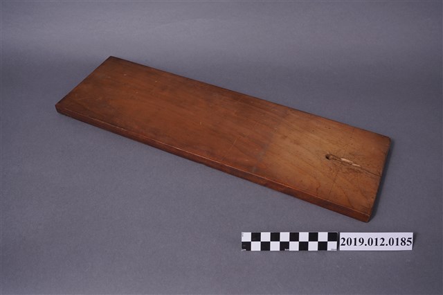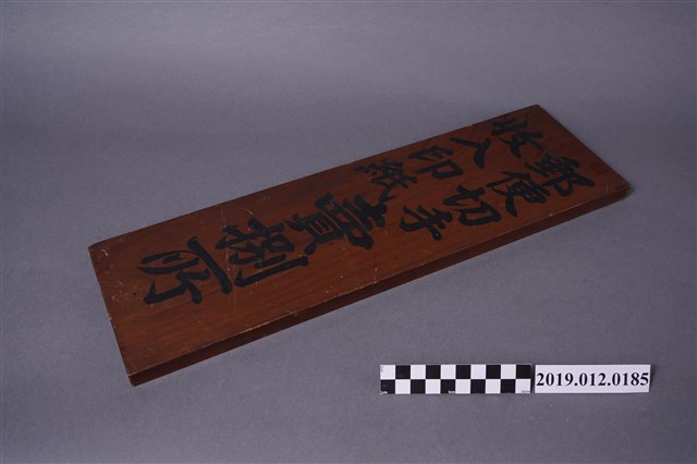 此文物為「郵便切手收入印紙賣捌所」,是一個木製招牌,上面印著黑色字體,背後有個掛勾。