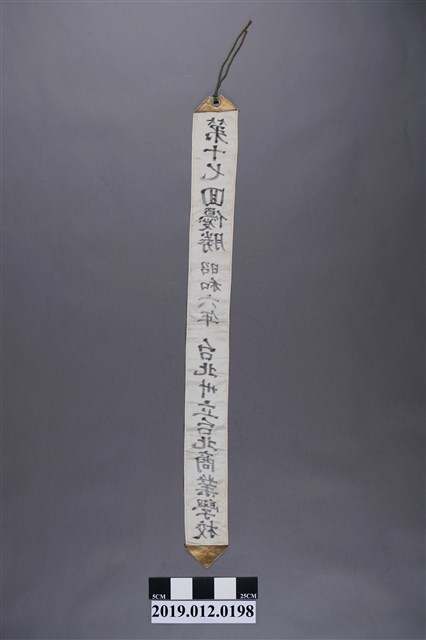 本文物一長條白布,寫有昭和6年(1931),臺北州立臺北商業學校第十七回優勝等字,在布條的最上方及下方則縫有金邊,布條下方呈三角形狀。