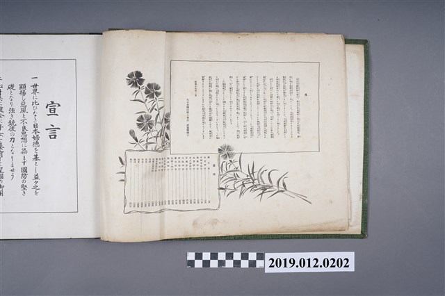 本文物為昭和17年(1942)2月大日本國防婦人會記念帖,全書以日文書寫,其中附有大日本國防婦人會在全國的分部位置與會員人數等資訊,也將其幹部職稱一併列入。