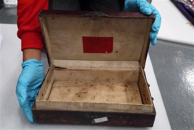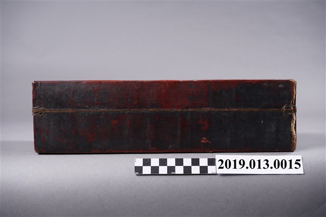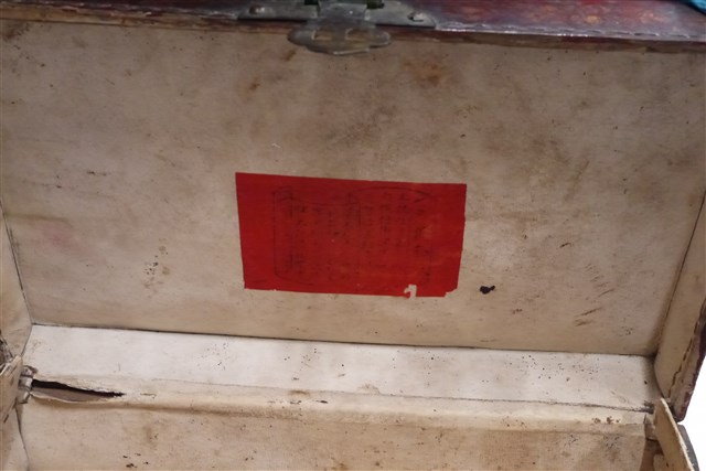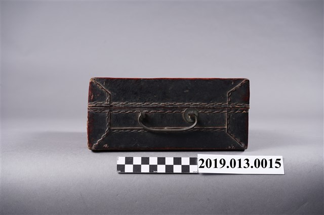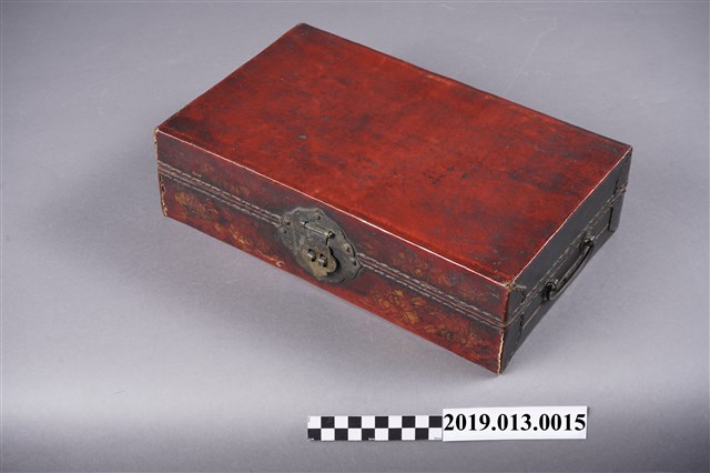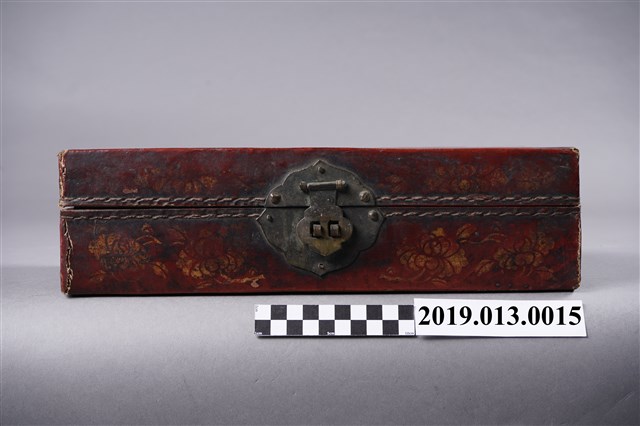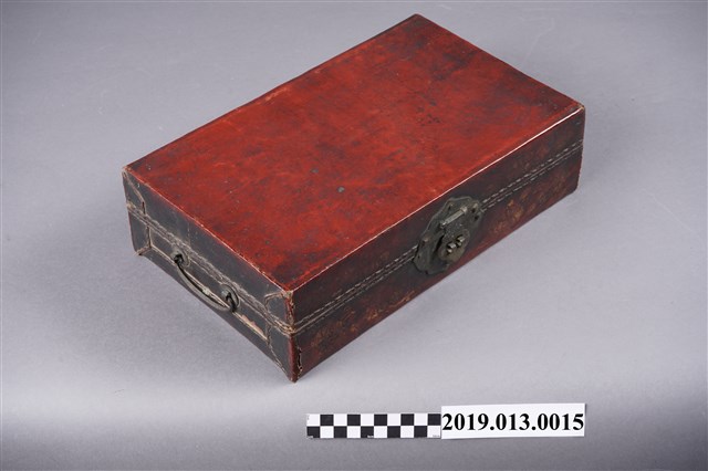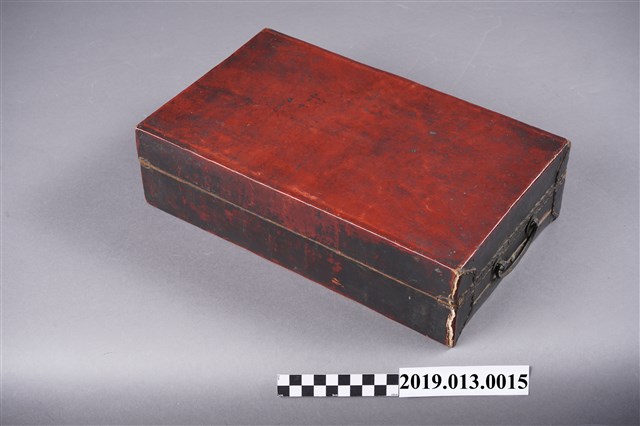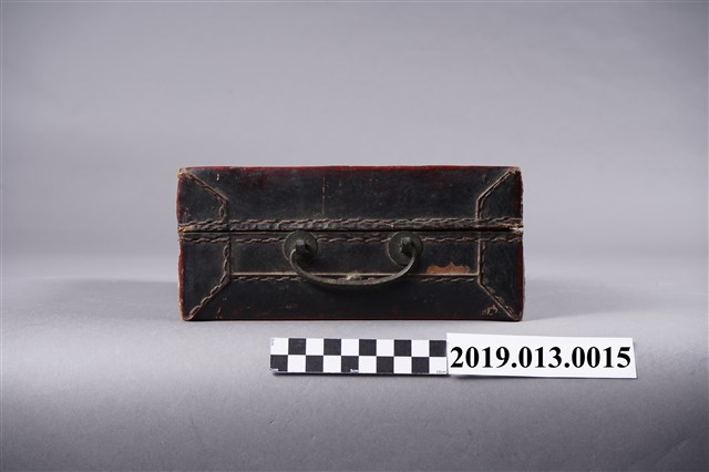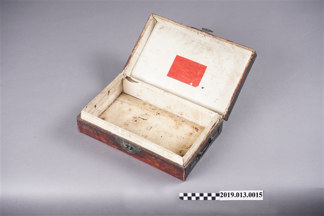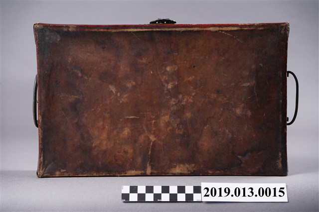 本文物為一紅棕色的皮箱,打開後內為米白色底部,在箱蓋下方,貼有一紅色標籤,其標籤上的文字,以模糊無法辨識內容。