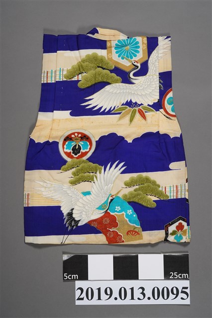 本文物為畫有鶴之背心,除畫有鶴外,更畫有許多植物圖樣,且色彩豐富。