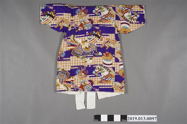 本文物為顏色豐富之和服,上畫有花瓶、扇子等圖樣,且色彩繽紛。