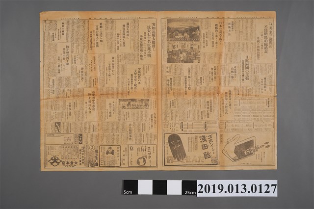 此文物為臺灣新民報於昭和9年10月21日所發行的第1322號報紙,版面上有十幾則新聞、幾個廣告及一些圖片,報紙上有些微破損。