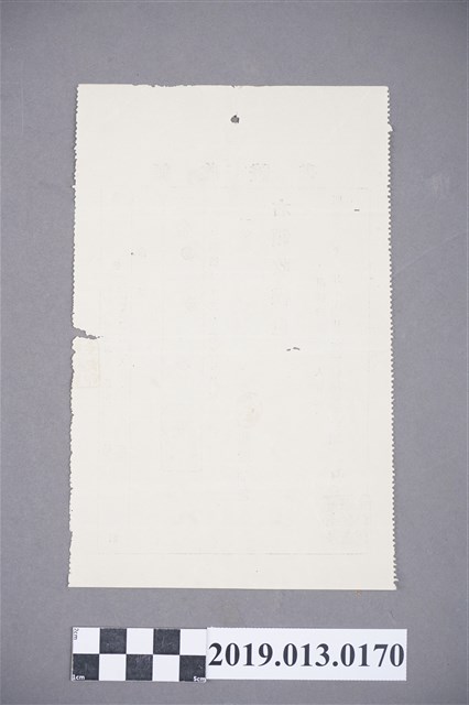 此文物為「明治33年領收證書」,標題為「領收證書」內容為「第八三八號明治三十三年度臺灣總督府歲入臺南縣池王爺納」中間部分是納的稅金,最後是時間「明治三十三年九月二十日臺南縣辨務署主記山下雄輔」,蓋有八個印章,紙的部分已有一些破損。領收證是作為交易時的信用交換憑證,在臺灣傳統的土地開發習慣上,一般於土地墾熟後,墾戶會派管事書役清丈土地,給予佃戶私丈單據,以定佃戶所應繳交的租穀數。