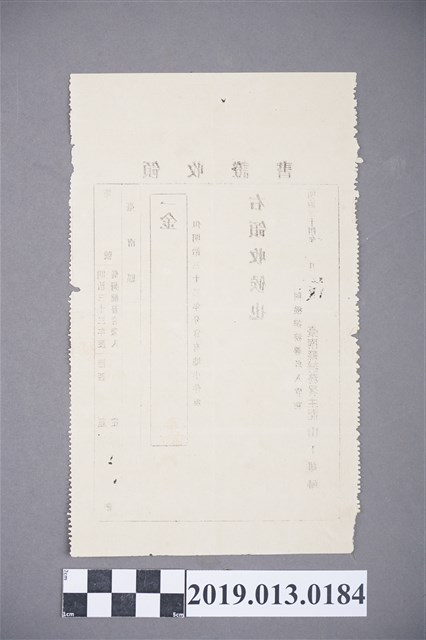 1.林孟欣,〈近代臺灣社會領收證使用的歷史意涵:以嘉義地區為例〉,《歷史臺灣 國立台灣歷史博物館期刊》,頁86-105。2.林文凱,〈「業憑契管」?清代臺灣土地業主權與訴訟文化的分析〉,《臺灣史研究》第十八卷第二期,頁 8-9。3.丘世馨,〈古文書契約的修護與保存-以國立臺灣歷史博物館籌備處之折損契約為例〉(台南市:國立台南藝術大學古物維護研究所,2006),頁12。