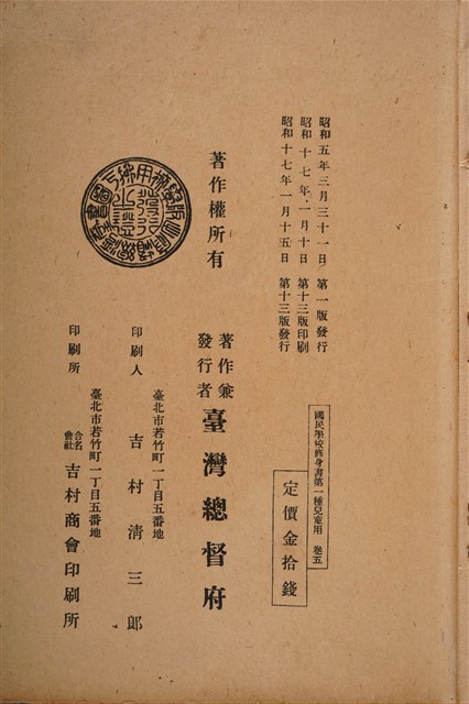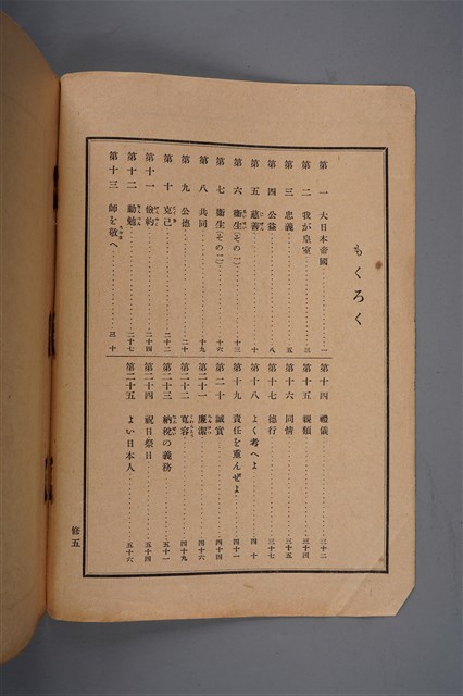 該物件為臺灣總督府分別於1930、1942年(昭和5年、17年)發行的國民學校修身書卷五。全書共二十五回,內容涉及日本帝國、皇室、國民美德和義務等國族建構之論述,以培養愛國精神,強化學生對國家之向心力。