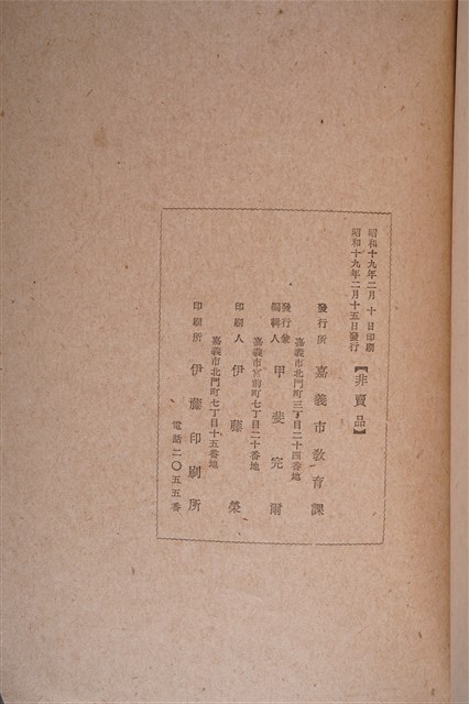 該物件為嘉義市教育課於1944年(昭和19年)2月15日發行的書籍《國民學校經營研究發表會日程要項並受業案》,內容是一系列針對臺南州嘉義市東門國民學校、旭國民學校學生所進行的教學研究成果。