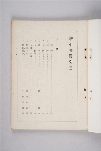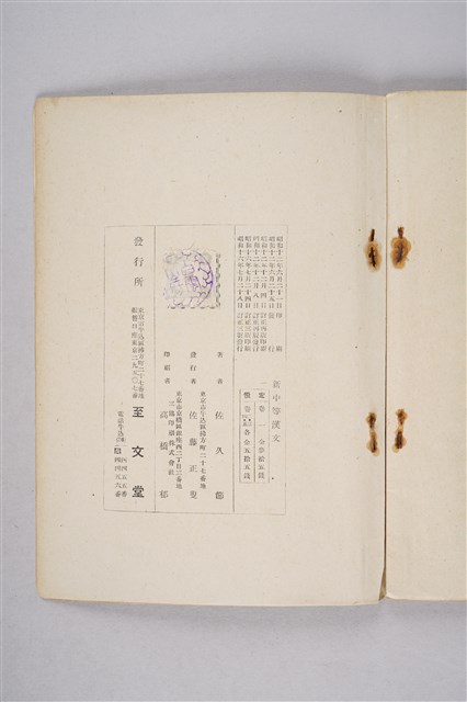 該物件為至文堂於1941年(昭和16年)再發行的中等漢文教材(初版日期為1937年6月25日),作者為佐久節。全書共五十八回,內容包含日本歷史、文學作品、朱熹及陶淵明的漢詩,以及天皇詔書等。封底寫有「應化‧一 34 施英明」。