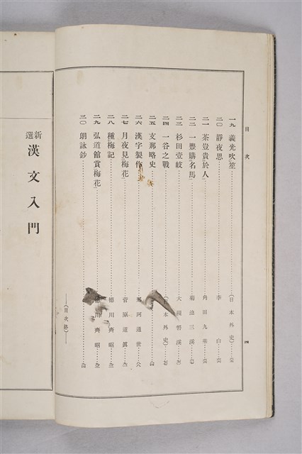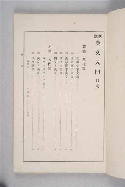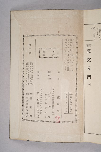 該物件為三省堂株式會社於1932年(昭和7年)發行的漢文學習書籍(1933年10月再版),由飯島忠夫所編。全書共三篇:基礎、入門和讀習。基礎篇傳遞關於漢文的基本概念,入門篇介紹漢文的讀法,讀習篇擇三十篇日本作家所撰之漢文為示。該書原物主為柯枝生,而書封內頁寫有「第一回 幹‧根(昭和十二年正月二日)」等字。