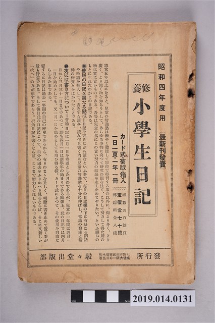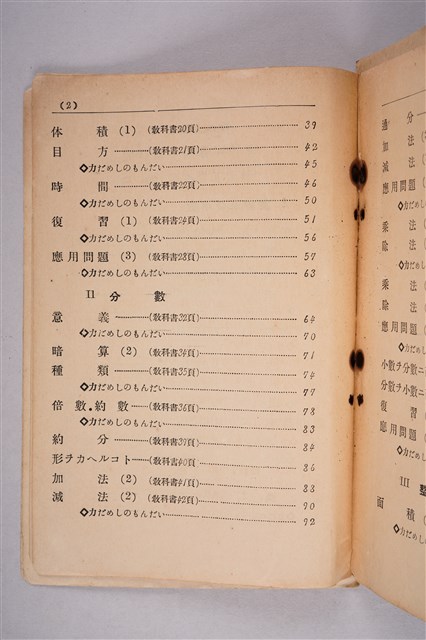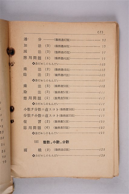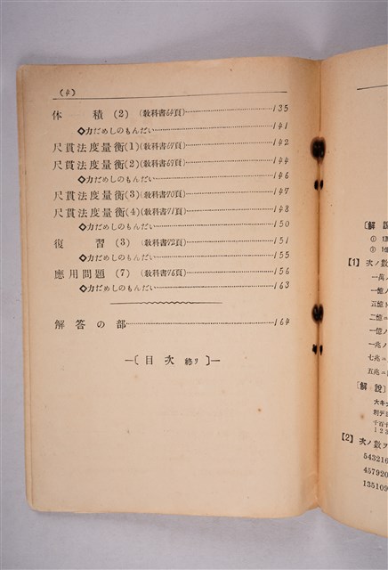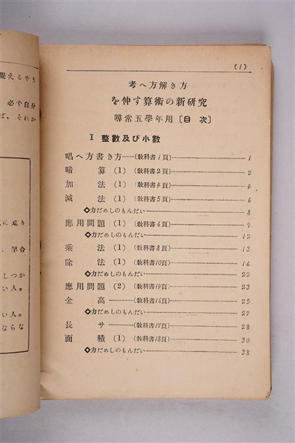 該物件為駸駸堂出版部於1931年(昭和6年)發行之算數科參考書,作為輔助教材供小學生研讀練習。主要內容為整數與小數應用面積和體積的計算方法,每單元列教科書頁數,方便學生配合學校課程複習。書末附有該出版社發行書籍之廣告。