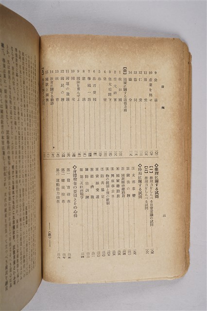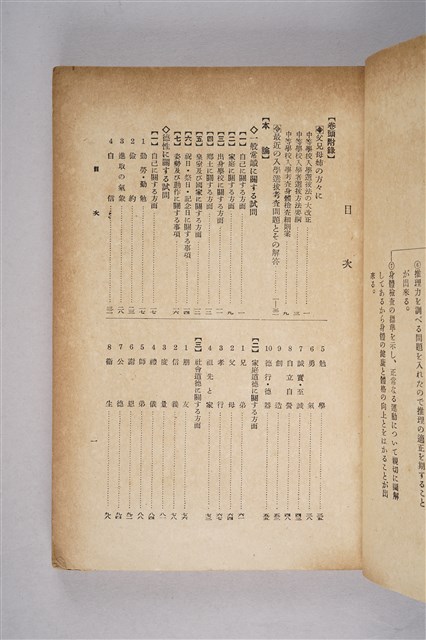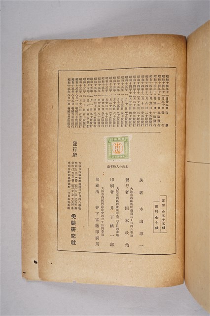 該物件為受驗研究社於1940年(昭和15年)8月10日增補再發行的《木山的人物考查》應試參考書(初版日期為1939年11月30日),作者為木山淳一。該書配合中等學校入學者選拔法的修正──以小學校長報告、中等學校人物考查及身體檢查三條件取代學科試驗作為選拔的標準,教導學生如何通過人物考查與身體檢查。內容包含個人、家庭及社會之道德原則,以及有關國家歷史、精神、政策、時局的問題,列舉模擬試題與參考答案,供學生應試。書末附受驗研究社出版之各式參考書籍目錄。