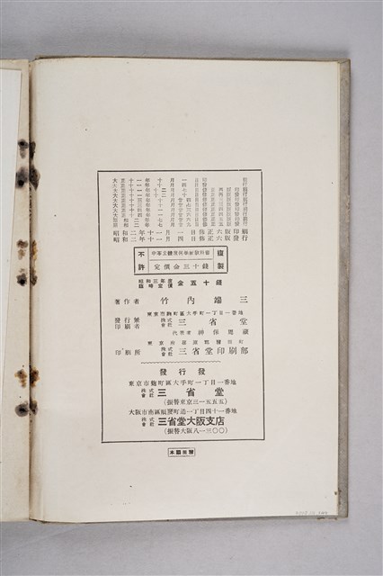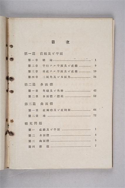 該物件為1927年(昭和2年)11月三省堂再版的立體幾何學教科書(初版日期為1922年10月),作者為竹內端三。全書共三編,包含直線、平面、多面體及曲面體之計算,供中學生學習。