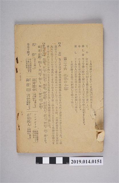 該物件為公學校用國語讀本自習書卷七。內容包含日本歷史文化、科學常識、生活事物等。每課可分成三部分:課文大意、生詞、應用句型。該書缺頁,亦無封面,無法知其詳盡的出版資料。