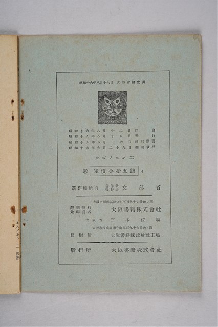 該物件為1941年(昭和16年)大阪書籍株式會社發行的算數課本第二冊。由於教材主要對象為小學生,全書內容未分章節,且均用片假名寫成,並附有全採插圖。