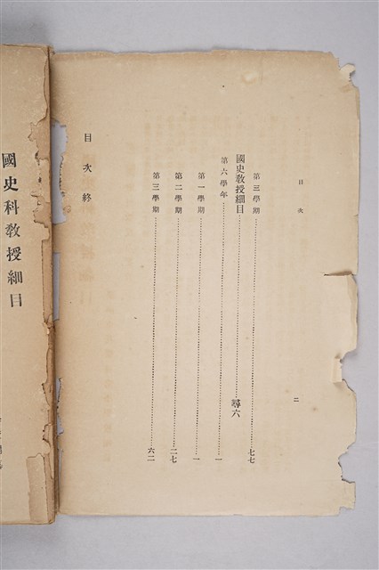 該物件為國史科(日本史)教學書籍,提供教材與已編排之課程綱要、內容,協助教師備課與授課。全書共五章,分別為:國史科教授要旨、教材的選擇、教學上之注意事項、第五及第六學年的授課內容。由於該書破損,封面缺漏,無法知其書名與出版資訊。