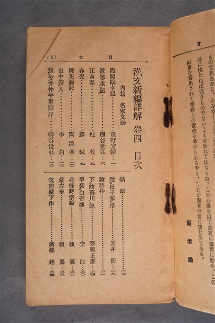 該物件為1922年(大正11年)6月15日東京辭書出版社發行的《漢文新編詳解》第四卷。全書分內外兩篇:前者為名家文鈔,集中日大家之作品;後者為史記鈔,多為中國史書內容,但亦有中國大家之詩文。