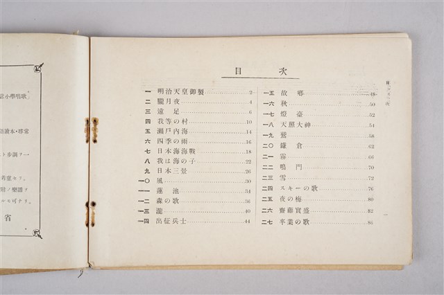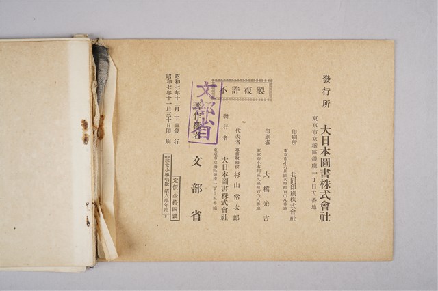 該物件為1932年(昭和7年)文部省與大日本圖書株式會社發行的小學歌本《尋常小學唱歌 第六學年用》。歌本收錄二十七首歌,歌曲內容包含日本地理歷史及其他生活事物。出版資料頁印有「文部省」之藍印。