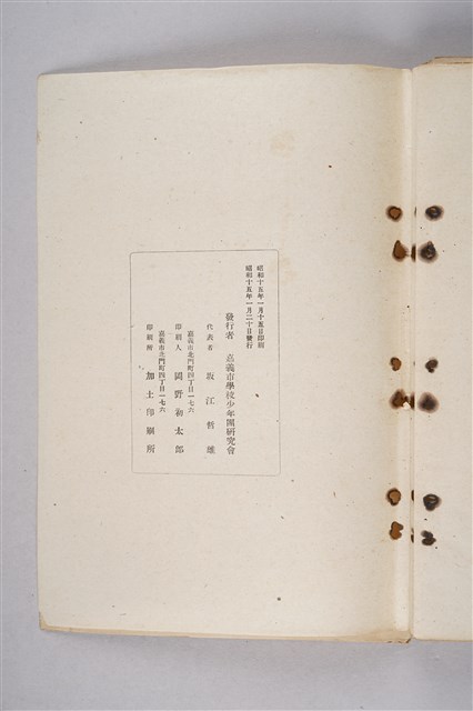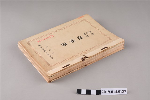 該物件為1940年(昭和15年)1月20日嘉義市學校少年團研究會發行的《學校少年團指導書》,為少年團指導員訓練少年團成員的教學書籍。針對不同學年的成員,每週均有相對應的教材。每一教材均有其指導項目、目的、要領與參考內容,所列甚詳。少年團簡介:為培養青少年成為願意服從、奉獻國家的國民,1941年(昭和16年)12月30日臺灣總督府公布「臺灣青少年團設置鋼要」,以地方區劃為單位,動員、組織十五歲以上二十四歲以下的青少年男女,給予精神、體育、國防、生活、產業及拓殖六項訓練,儲訓未來勞動力。封面印有「新化公學校虎頭埤分教場」之紅印。