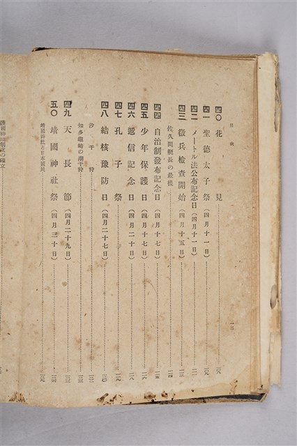 該物件為1942年(昭和17年)6月10日八光社再版發行的《國民學校儀式行事精義》,明列所有節日及應配合的儀式,作者為國民教育研究會(初版日期為1941年5月20日)。戰時,日本政府為凝聚全國人民,增強愛國意識,藉著由一連串新舊節日及其儀式所構成的全國性活動,提升人們的社會參與度,塑造國族的共同記憶。