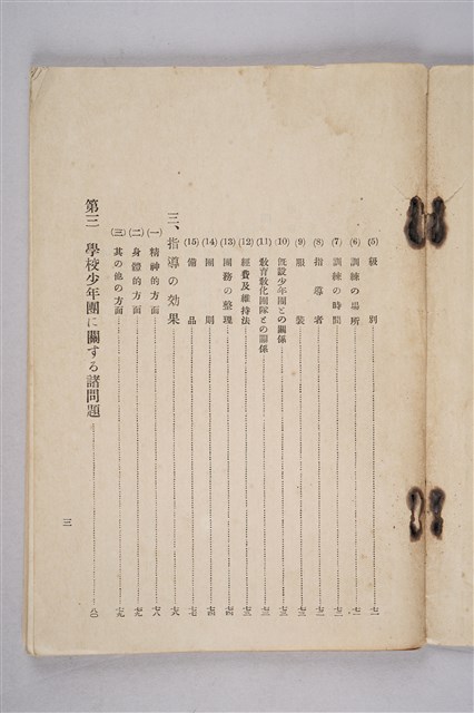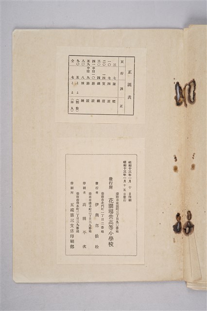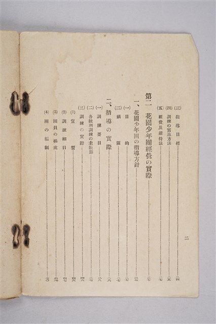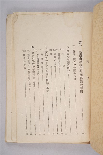該物件為花園尋常高等小學校於1938年1月5日發行的書籍《臺南市の提倡する學校少年團經營の實際》,旨在報告臺南市學校及該校少年團的經營情況。少年團簡介:為培養青少年成為願意服從、奉獻國家的國民,以地方區劃為單位,動員、組織十五歲以上二十四歲以下的青少年男女,給予精神、體育、國防、生活、產業及拓殖六項訓練,儲訓未來勞動力。
