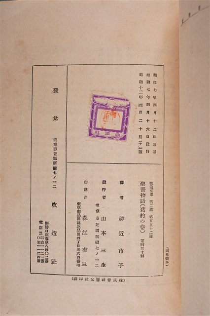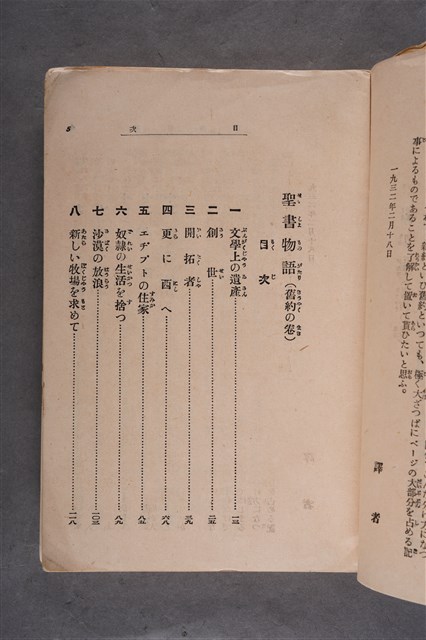 該物件為1937年(昭和12年)4月20日由改造社再版的翻譯書籍《聖書物語(舊約の卷)》(初版日期1932年4月16日),旨在介紹、分析舊約聖經。譯者為神近市子。